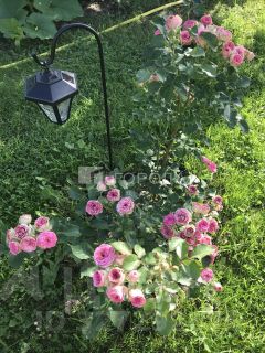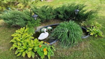 На участке множество многолетних цветов и плодовых кустарников. Есть декоративный прудик и зона отдыха.