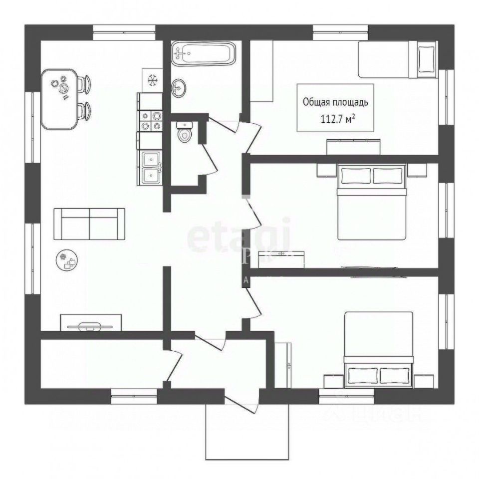 3 комнаты + кухня гостиная, 2 санузла, котельная.