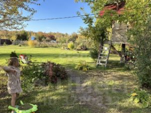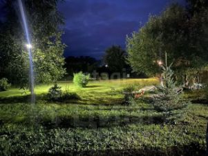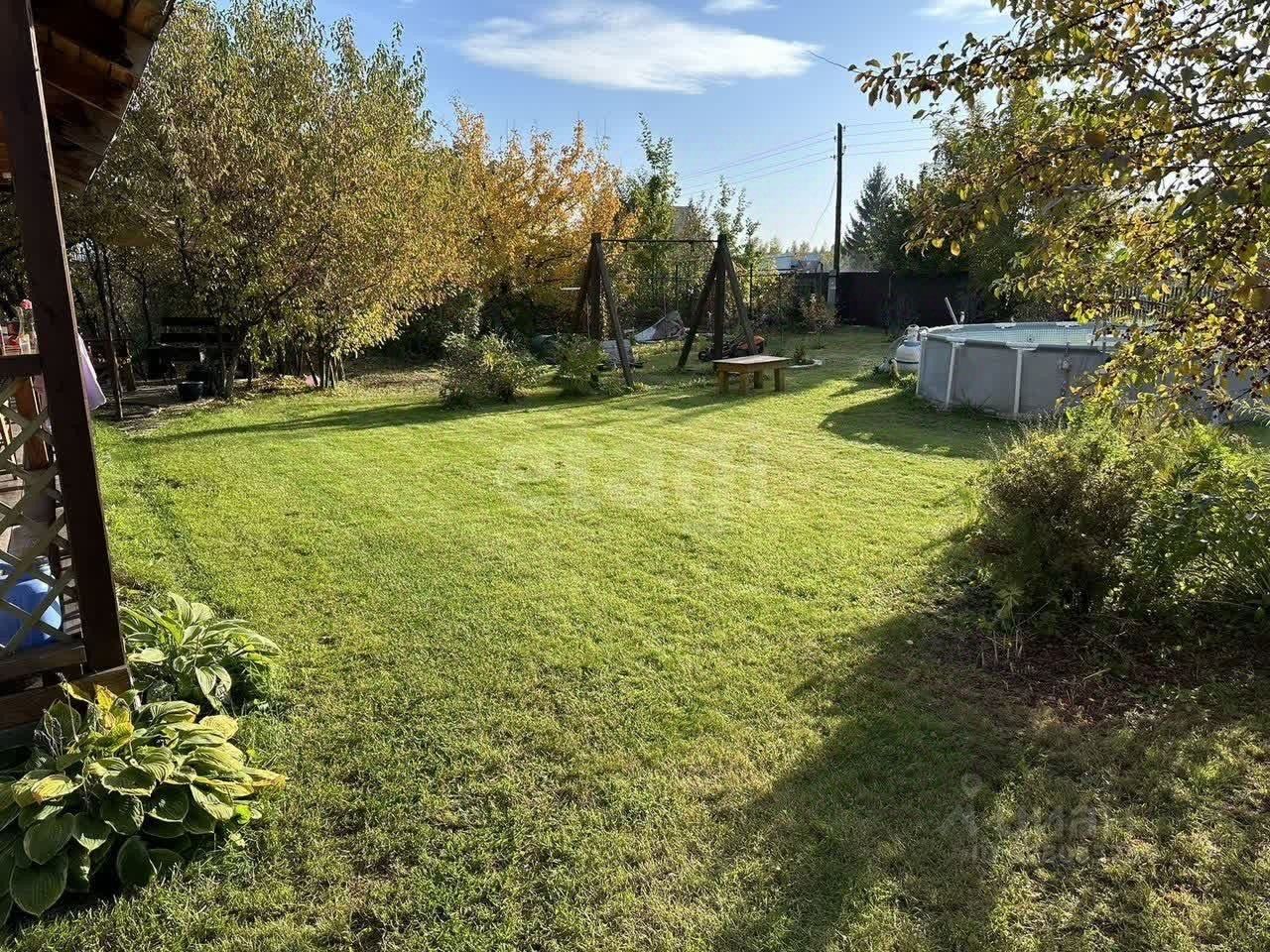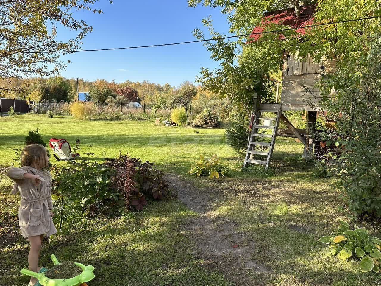 Участок с ухоженным ландшафтом: посеянный и регулярно подстригаемый газон, плодово-ягодные посадки (клубника, малина, крыжовник, жимолость, виноград, дающий урожай) и декоративные многолетники, включая розы. Дополняют картину взрослые деревья — береза, клен, хвойные и плодовые культуры.