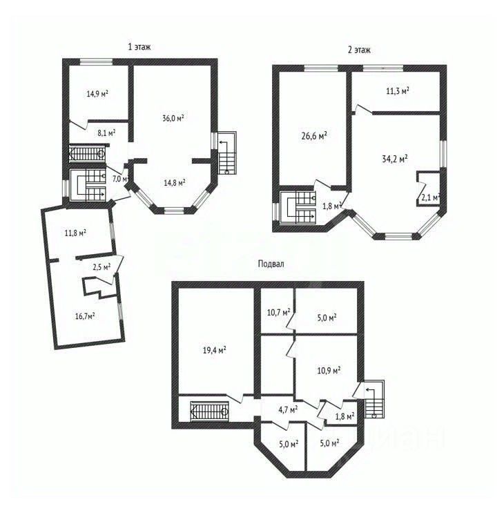 Большой кирпичный дом на три этажа с цоколем.
