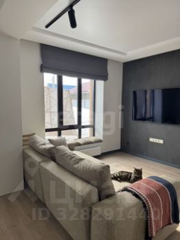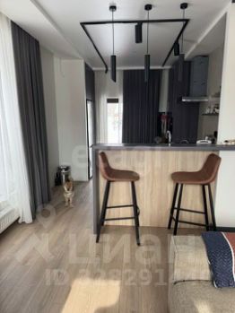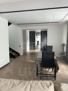 На первом этаже расположена просторная кухнястоловая, оборудованная современной встроенной техникой и дополненная удобной барной стойкой. Гостиная зона оснащена большим телевизором и укомплектована стильной мебелью.