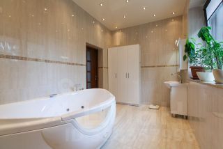 Большой санузел с красивым видом на свой берёзовый лес, с подогревом пола и с техническим сливом в пол, джакузи 600 л., унитаз с термостатическим гигиеническим душем, большая душевая кабина 1.4 м х 1.4 м. Маленький гостевой санузел.