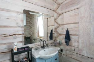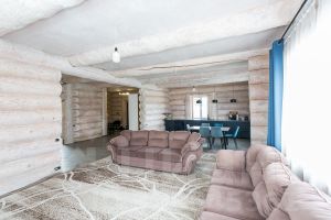 Здесь нет типовых решений. Наружные стены — массив сосны и кедра диаметром 60 см, окорённый вручную, бережно обработанный льняным маслом. Дерево дышит, естественно регулирует микроклимат, не промерзает даже в суровые зимы. Монолитный ленточный фундамент шириной 1 м, утеплённый в два контура, усиленные пустотные плиты перекрытия, потолки 3,3 м — инженерная честность, скрытая за природной эстетикой.