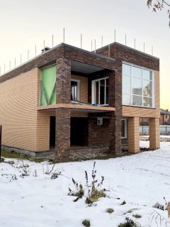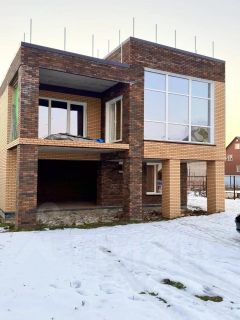 Современный трехэтажный кирпичный Коттедж с плоской эксплуатируемой кровлей-террасой, гаражом на две машины под самоотделку.