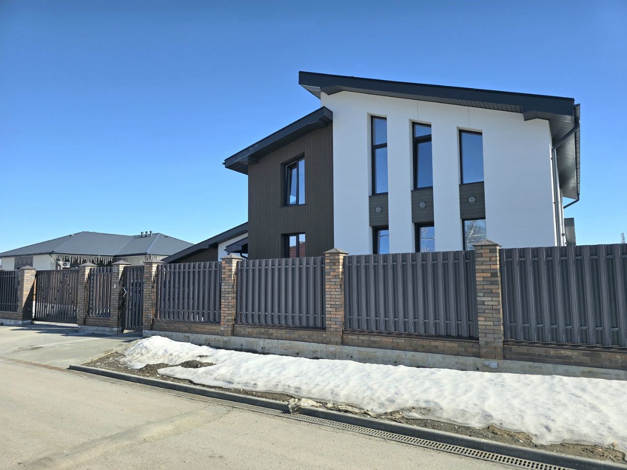 Территория участка огорожена со всех сторон с дополнительным въездами и откатными воротами;