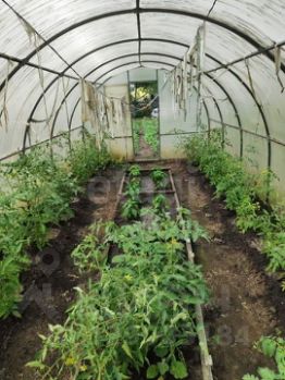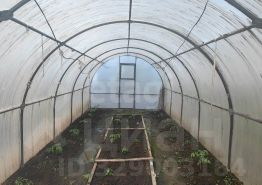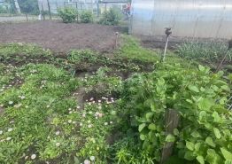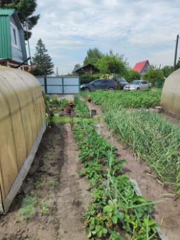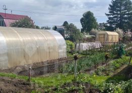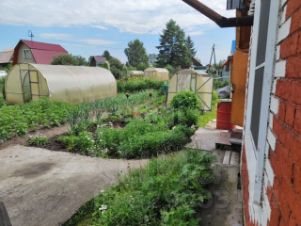 - Посадки: грядки с помидорами и огурцами, кусты малины и смородины.