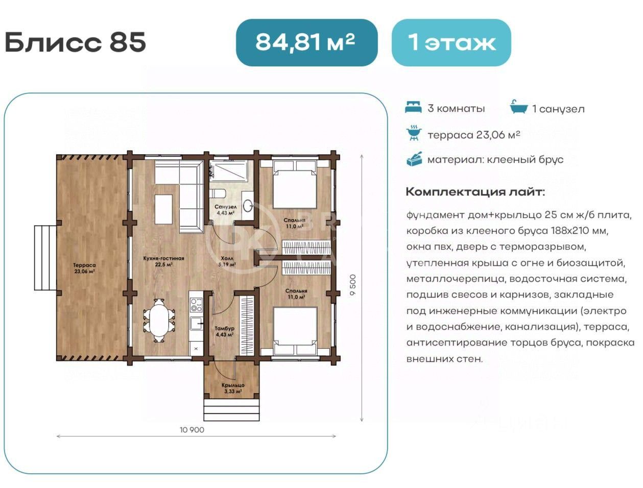 Дом из премиального материала - клееного бруса общей площадью 85 кв.м на ровном участке 7 соток. Все коммуникации заведены.