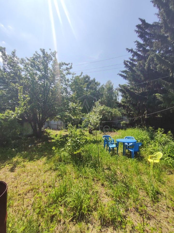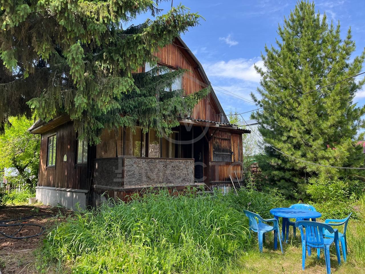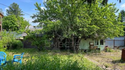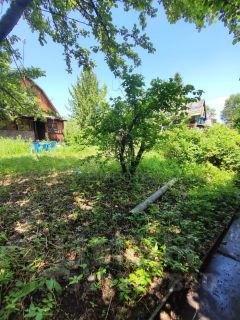 Участок земли 6 соток, на котором растут смородина, малина, жимолость, ранетка. Два огромных хвойных дерева дают затенение на участке, помогающее укрыться от знойной жары в летнее время.