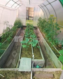 Огород с грядками. Теплица с высокими грядками. Уличный туалет. Металлический хозблок для хранения садовой техники и инвентаря.