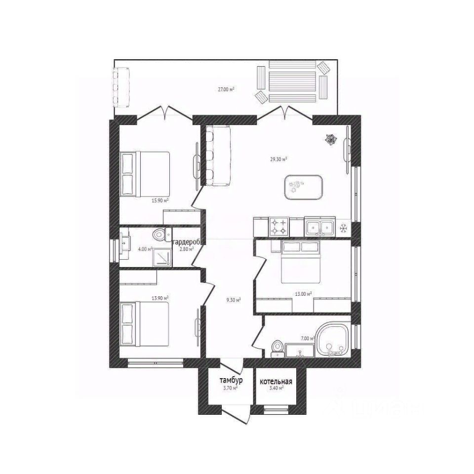 + терраса -деревянная, 27 кв. м. с выходом из гостиной