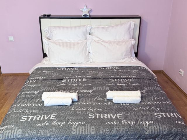 Мы предусмотрели в ней всё для вашего комфортного проживания: отличный ремонт, хорошая мебель, большая новая двуспальная кровать с ортопедическим матрасом, раскладной диван. ЖК телевизор, кухонный гарнитур со всеми обеденными принадлежностями на 3 человека и микроволновая печь, электрочайник, стиральная машина, фен, утюг, сушилка, гладильная доска, всегда свежее постельное белье и полотенца, туалетная бумага и прочие мелочи необходимые для проживания имеются.