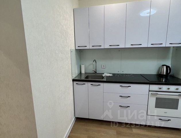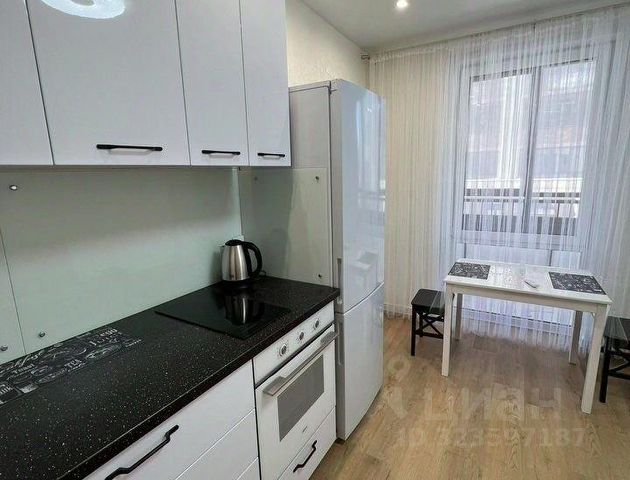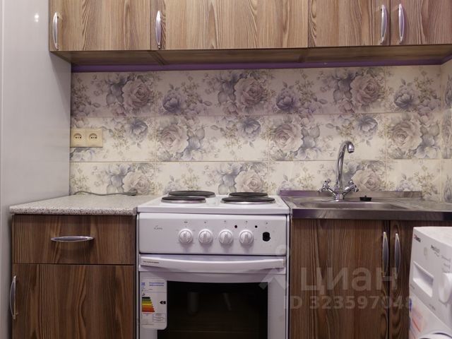Кухня аккуратная, с новым гарнитуром серого цвета, варочной плитой и фартуком с фотопечатью (Париж). Есть стол и табуреты, электрочайник. Жилая комната диван, кресло, столик, шкаф. Потолки натяжные с точечными светильниками, свежий ремонт, пол — ламинат. Прихожая шкаф-купе и вешалка с зеркалом, всё в хорошем состоянии. Санузел совмещённый установлена стиральная машина, унитаз, ванна, плитка на стенах и полу. Дом пятиэтажный, зелёные балконы, вокруг ухоженная придомовая территория с цветами.