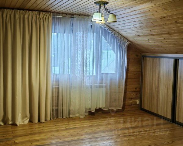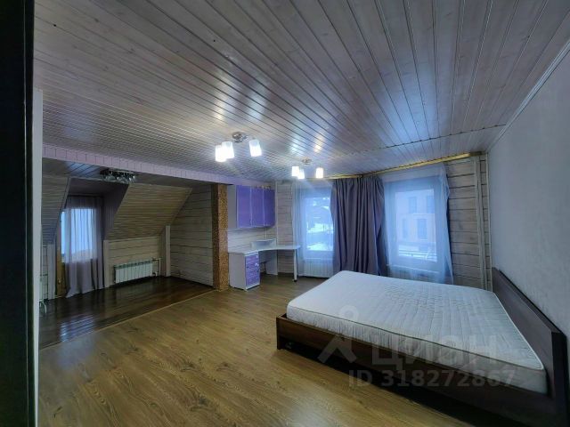 Спальня на втором этаже с кроватью king-size, двумя окнами и полноценной рабочей зоной — письменный стол, встроенные шкафы.