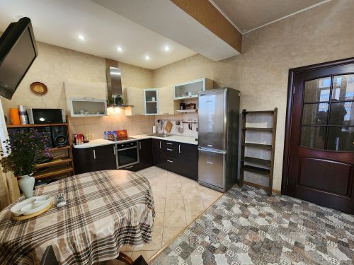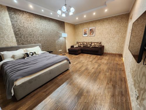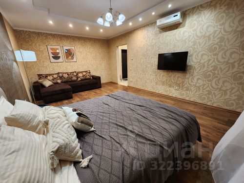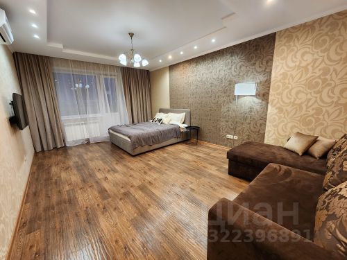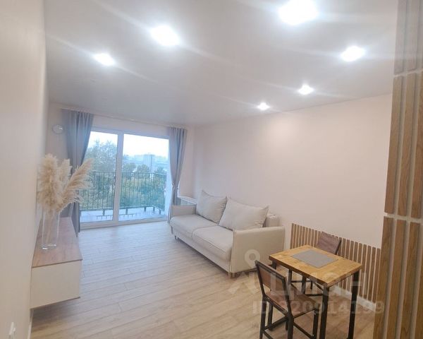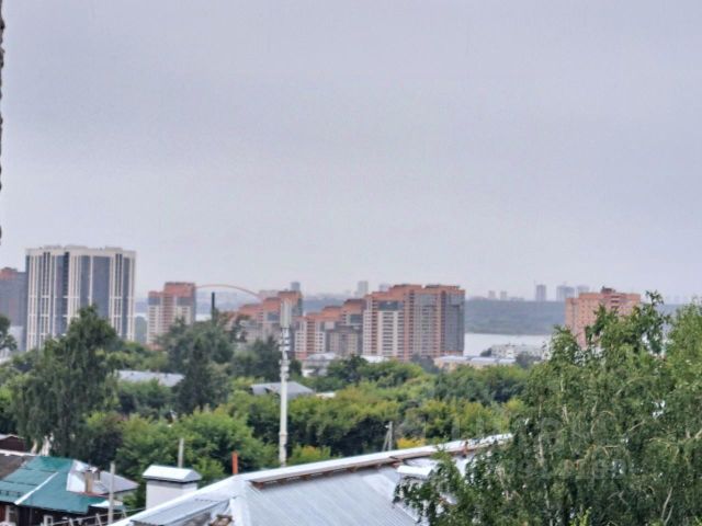 На кухне — встроенный гарнитур с варочной поверхностью, раковиной и стиральной машиной. Всё выполнено в бело-серой гамме, выглядит аккуратно и практично. В комнате — раскладной диван, кровать, белая мебель для хранения, телевизор, рабочее место с письменным столом и монитором. Есть выход на балкон через широкие окна с плотными шторами. Ванная комната отделана плиткой: красно-голубое сочетание, установлена душевая кабина и подвесной унитаз. Также стоит большой холодильник и техника (микроволновка, мультиварка, чайник). Из окна открывается вид на город с высоты — район с многоэтажками и зелеными дворами. Снять квартиру-студию в микрорайоне Южный в городе Бердск на длительный срок.