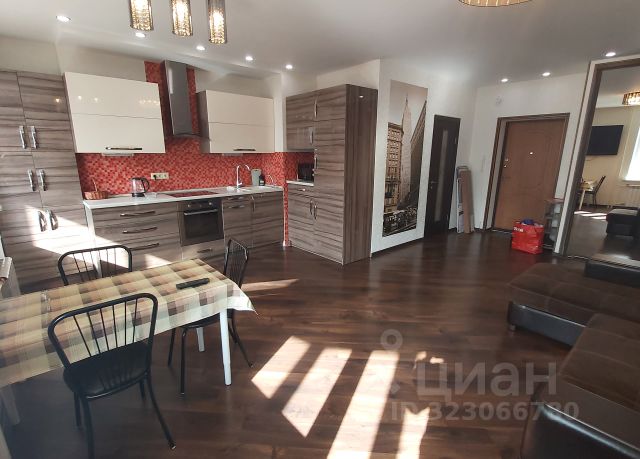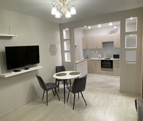 Большая однокомнатная квартира-студия после дизайнерского ремонта в новом доме (перепланировка из однокомнатной в студию!). В квартире установлены большой телевизор 50", огромный встроенный зеркальный шкаф-купе с необходимым наполнением комод, полки и т.д., прихожая, большой удобный диван с просторным спальным местом. Обеденный стол.
